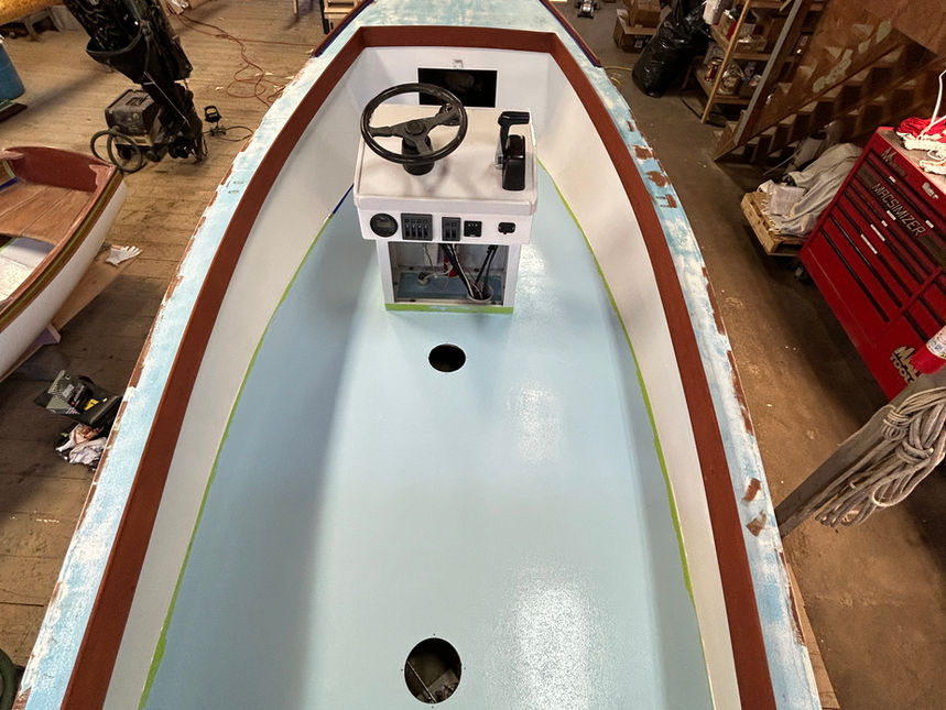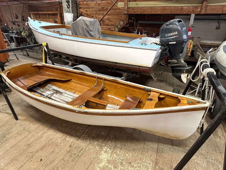 OPEECHEE, an 18-foot skiff built by local students in Downeast Maine, was damaged after getting caught on the wrong side of a gangway while docked. She came into Stillman Marine for a few repairs, along with fresh paint and varnish.