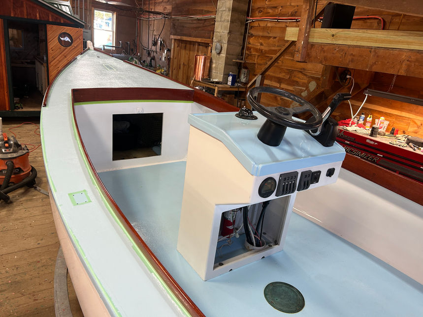 ALLEGRO, an electric-powered launch with a glass-over-wood hull, came into Stillman Marine for a fresh paint job, minor repairs, and a battery charger upgrade.